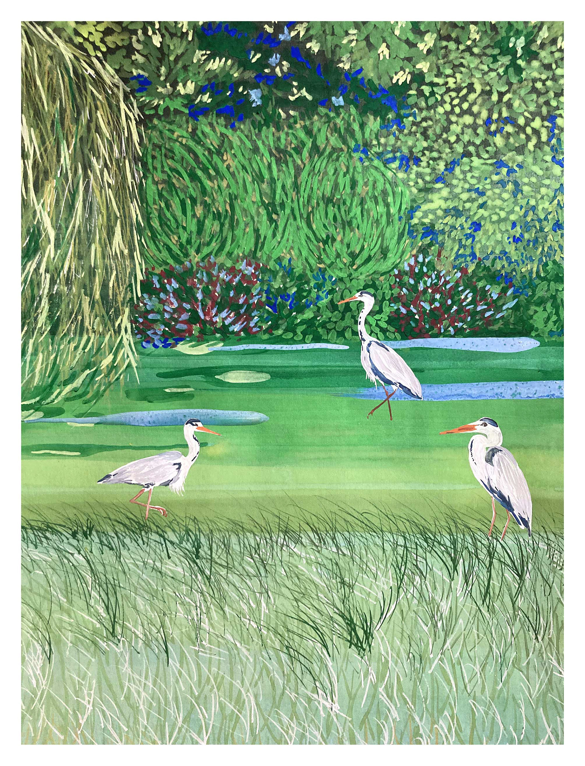 Trois Hérons-2022, tempera sur papier aquarelle 300 gr 50 x 65 cm. 350 €