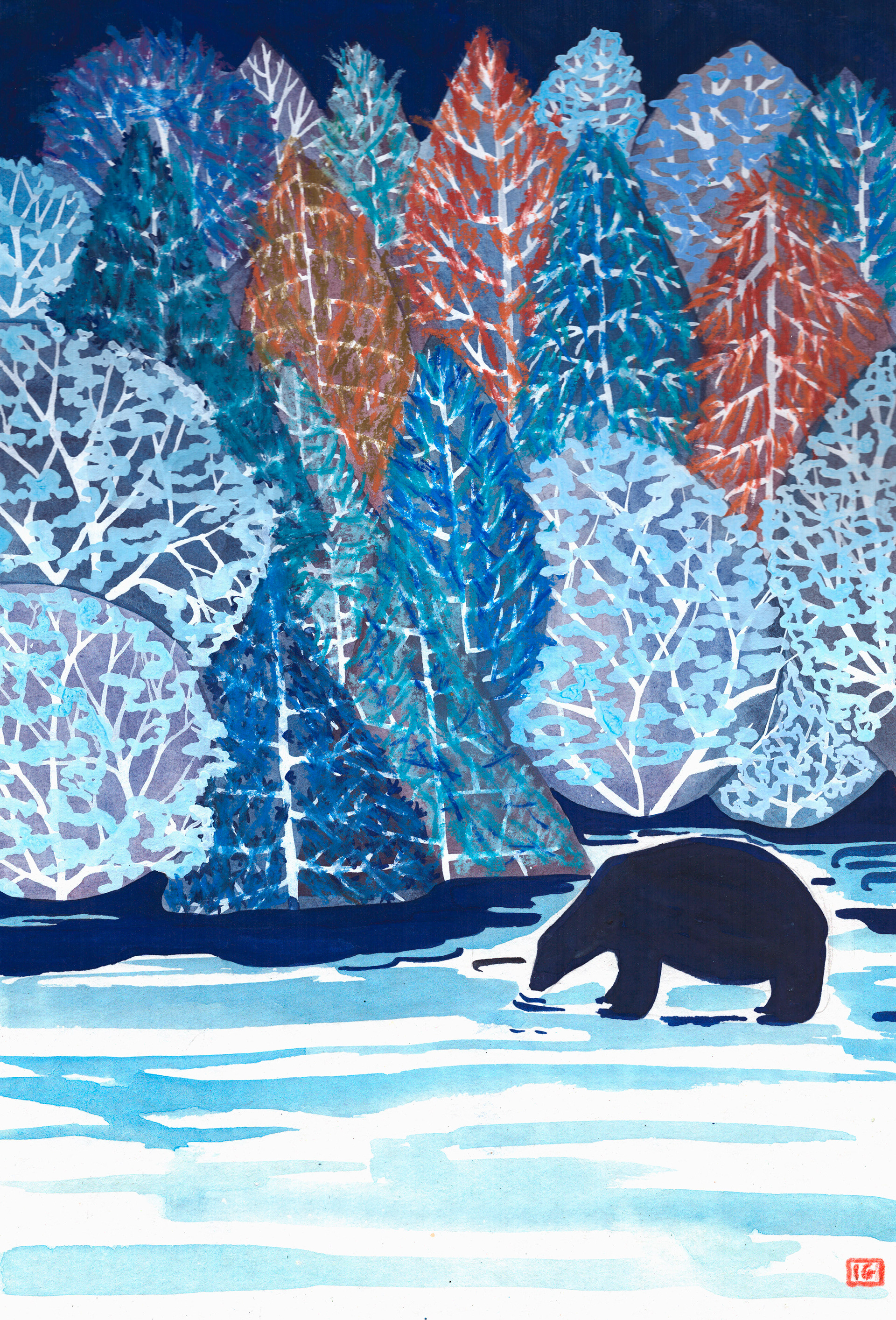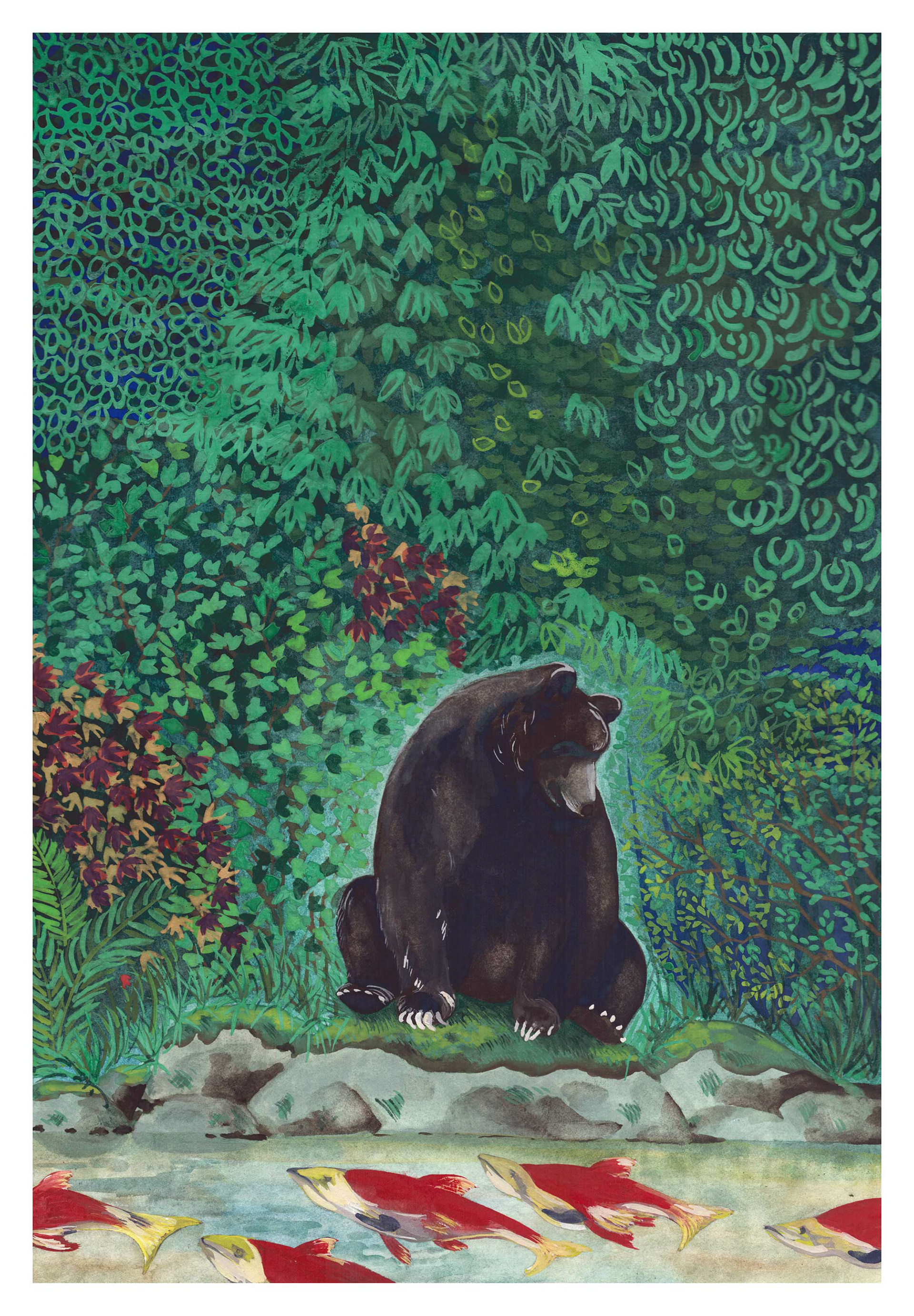 Ours noir et saumons, 2020, tempera sur papier aquarelle, 30 x 42 cm . 350€