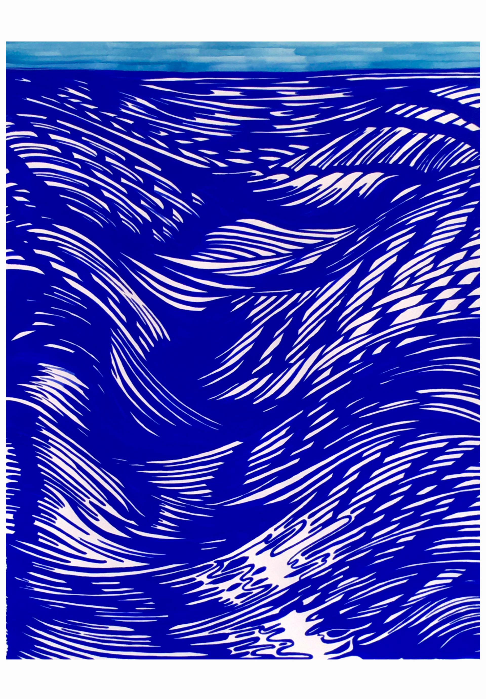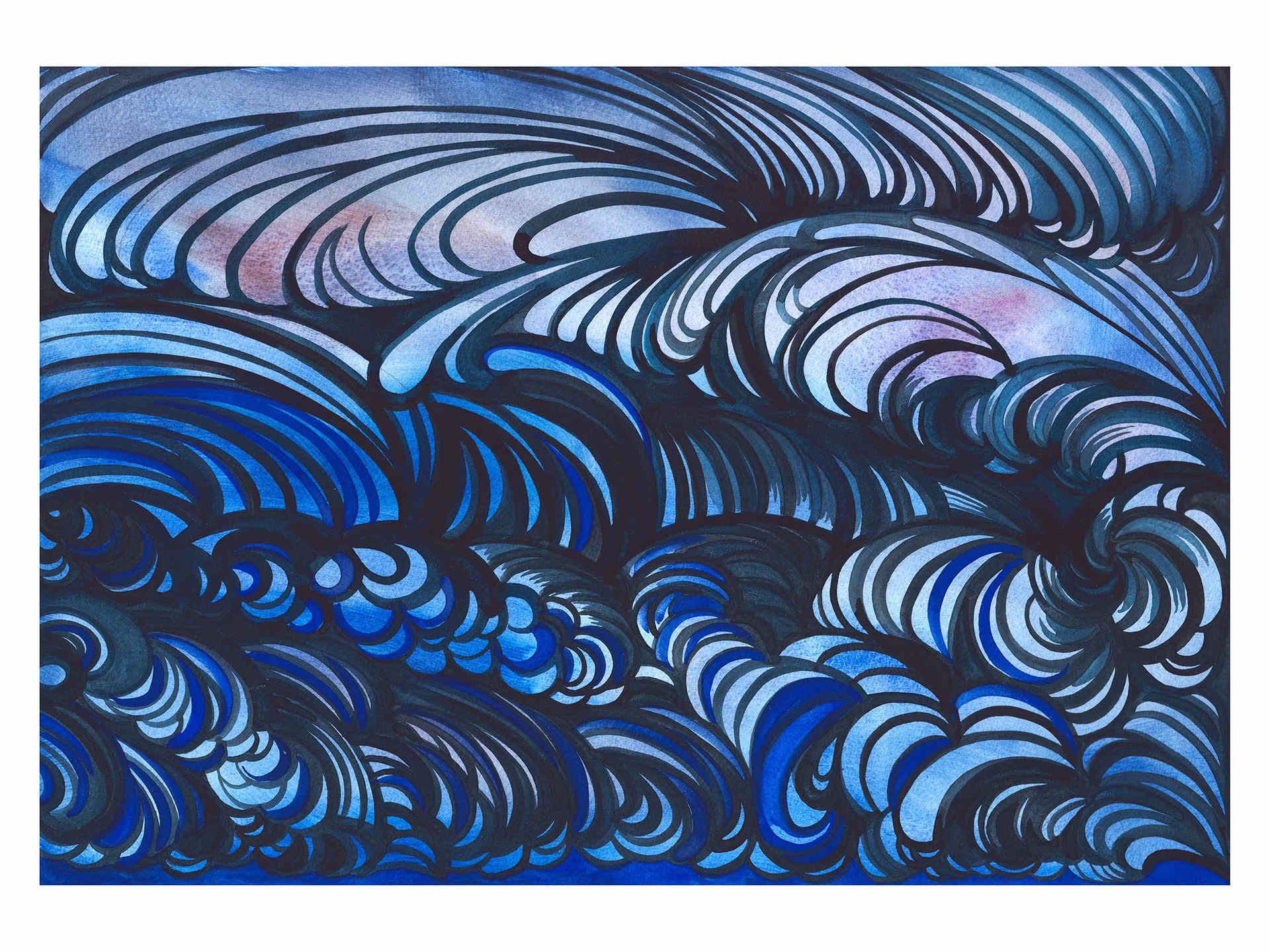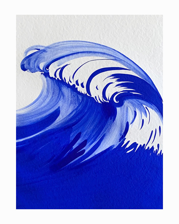 Peinture aquarelle pigment bleu outremer foncé broyé à la main avec un liant de gomme arabique sur papier de différents grammages et formats variables. Ci dessous vagues de 2020 à 2024.