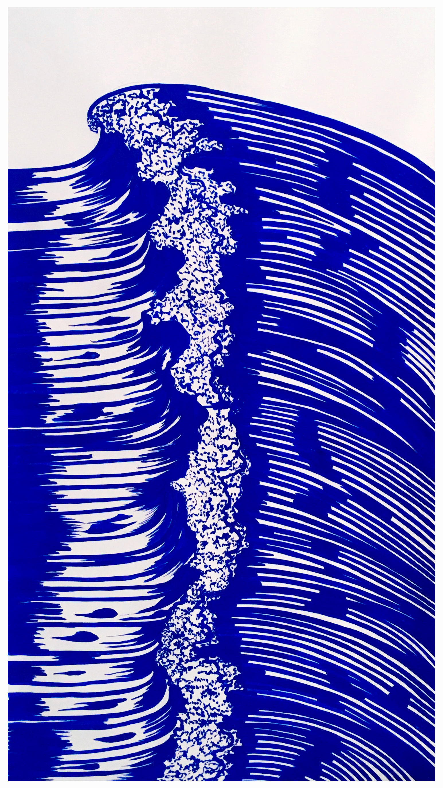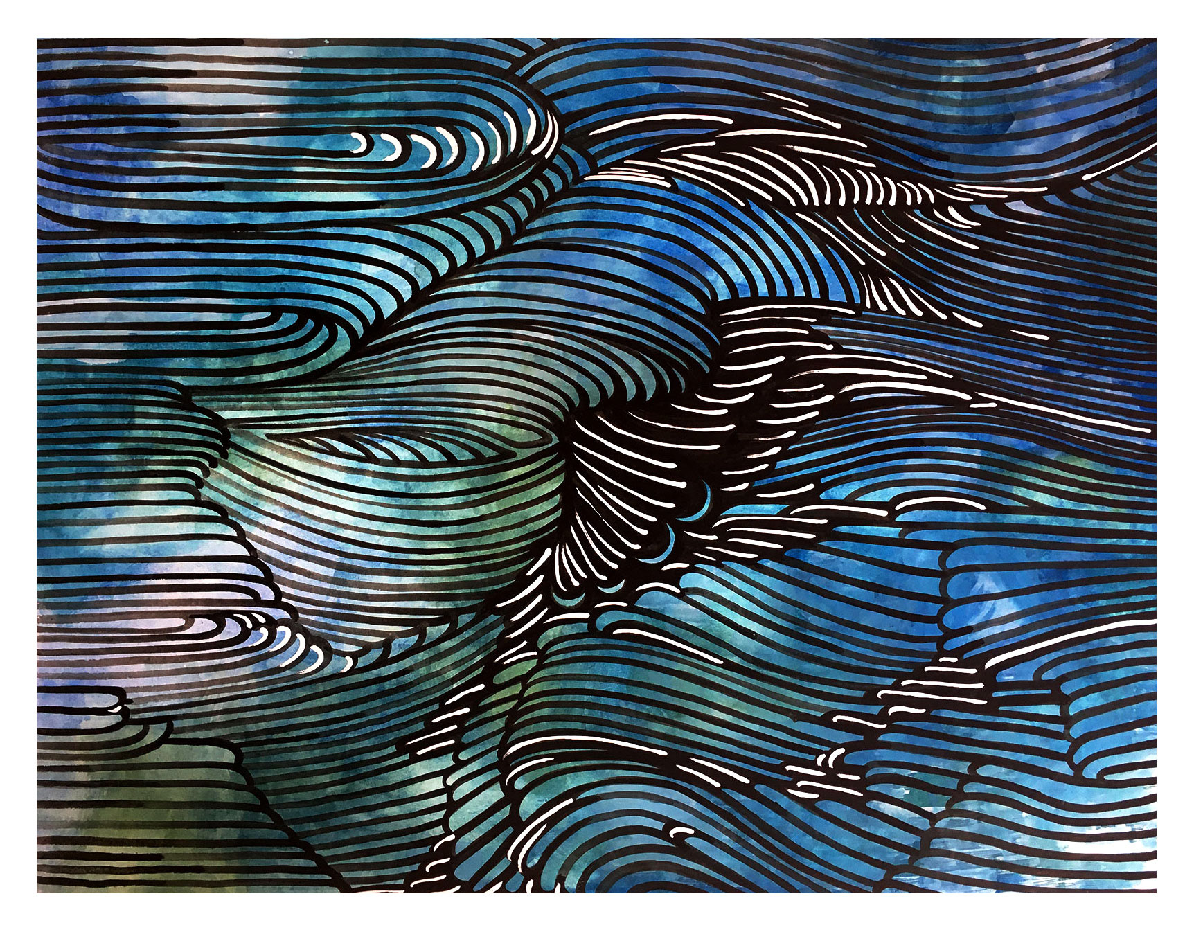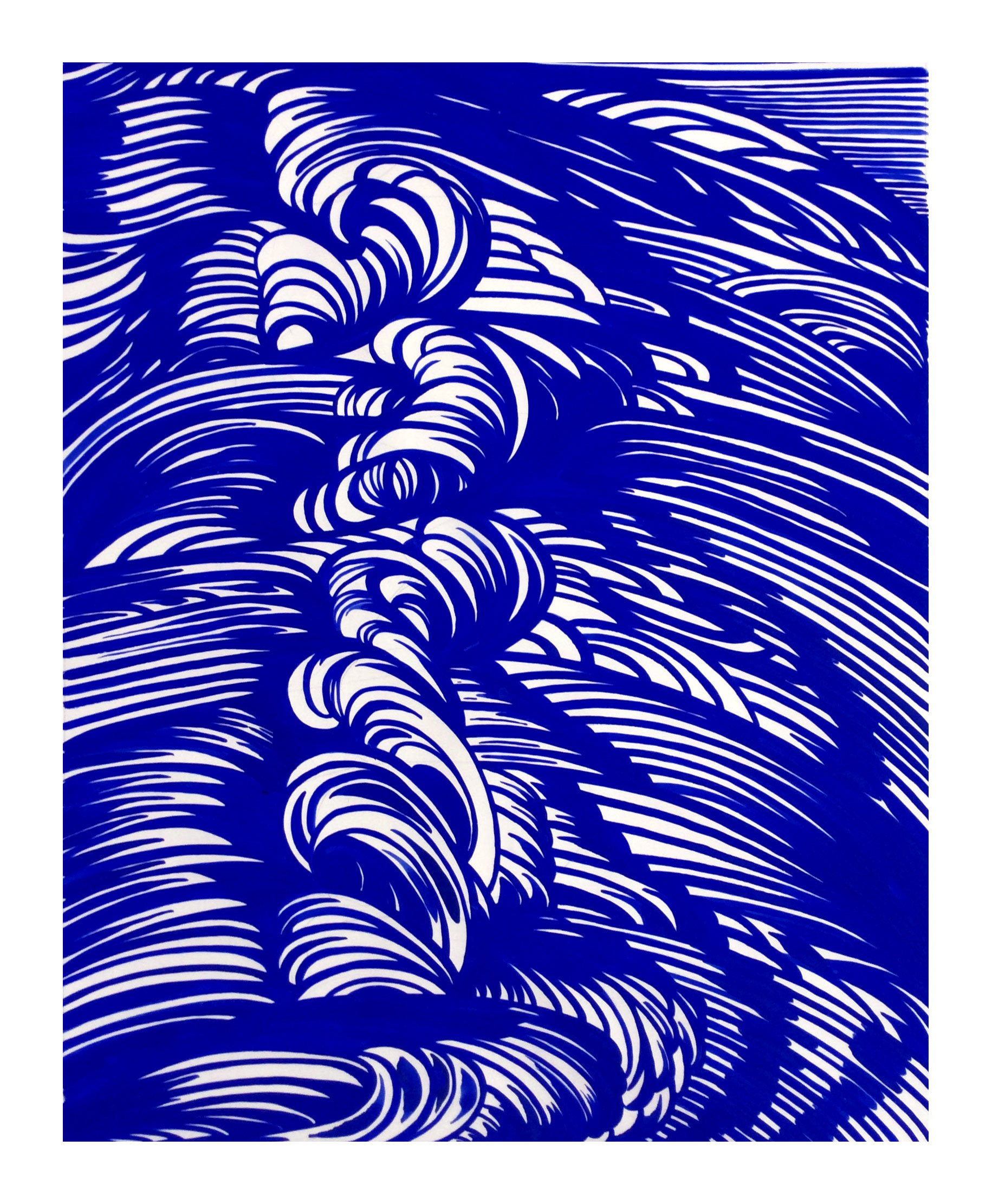 Peinture aquarelle pigment bleu outremer foncé broyé à la main avec un liant de gomme arabique sur papier de différents grammages et formats variables. Ci dessous vagues de 2020 à 2024.